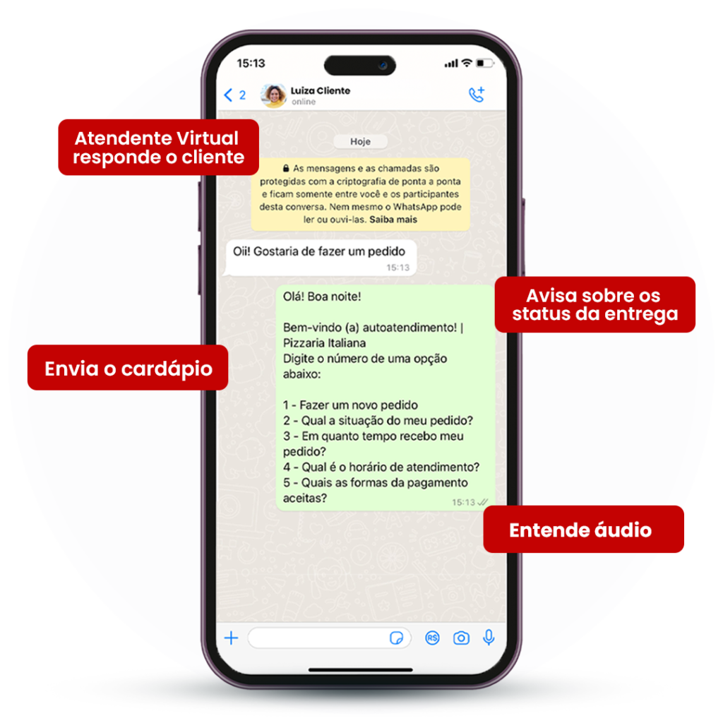 A partir da primeira mensagem, o robô inicia o atendimento de maneira automatizada, respondendo às perguntas de forma instantânea.